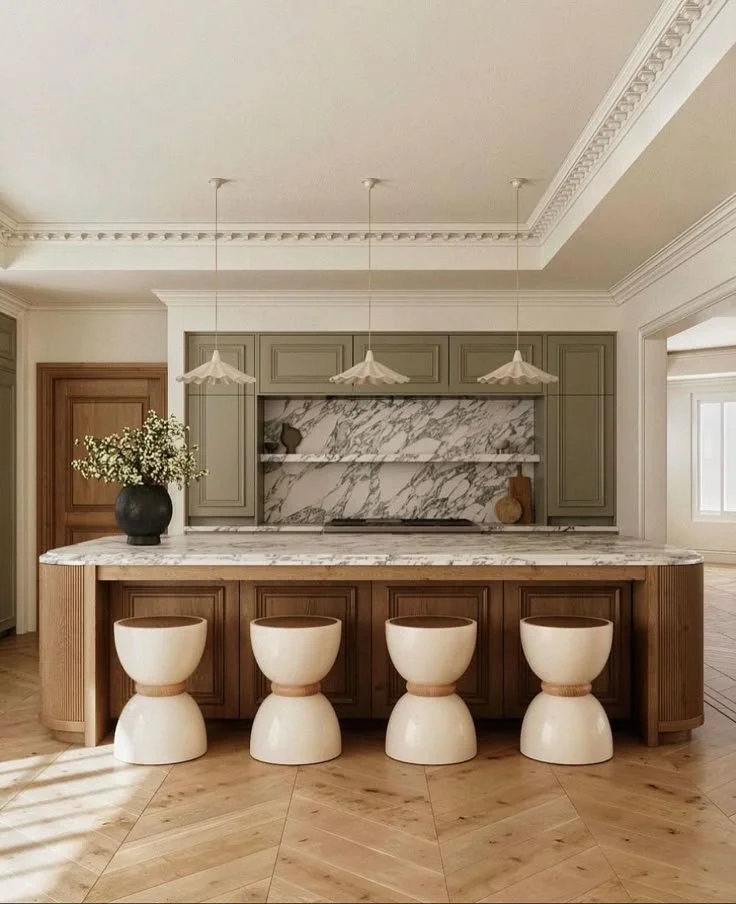 The kitchen is often treated purely functionally with flat cabinets, sterile finishes, and utilitarian shapes. But when approached with Haussmann cues, it becomes something richer.